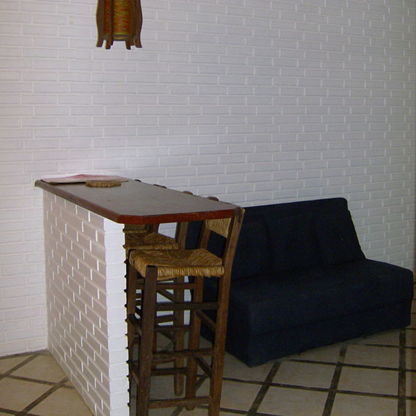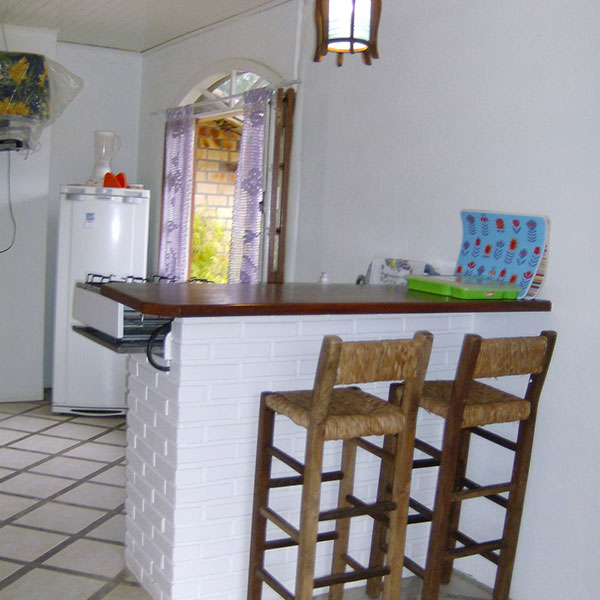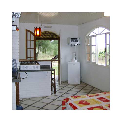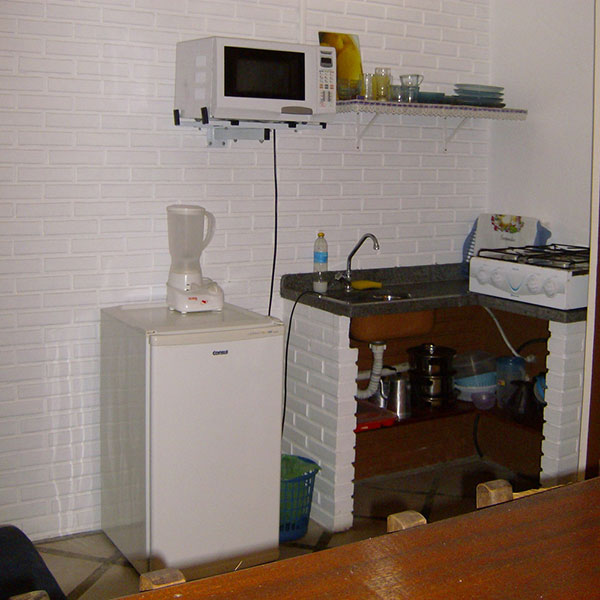 Pequeno espaço com fogão de 4 bocas, forno de microondas, refrigerador, liquidificador e demais utensílios indispensáveis para o seu conforto.